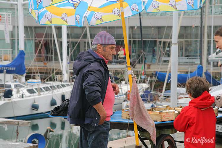 За эстакадой в рыбных рядах бывшего склада в Porto Antico грязно и шумно, туристы стараются обойти их стороной, ныряя в ближайший проулок старой Генуи или же проносятся мимо самодельных витрин с осьминогами и гребешками с такой скоростью, что дешевые китайские платочки, продающиеся здесь же, едва успевают махнуть им вслед.
